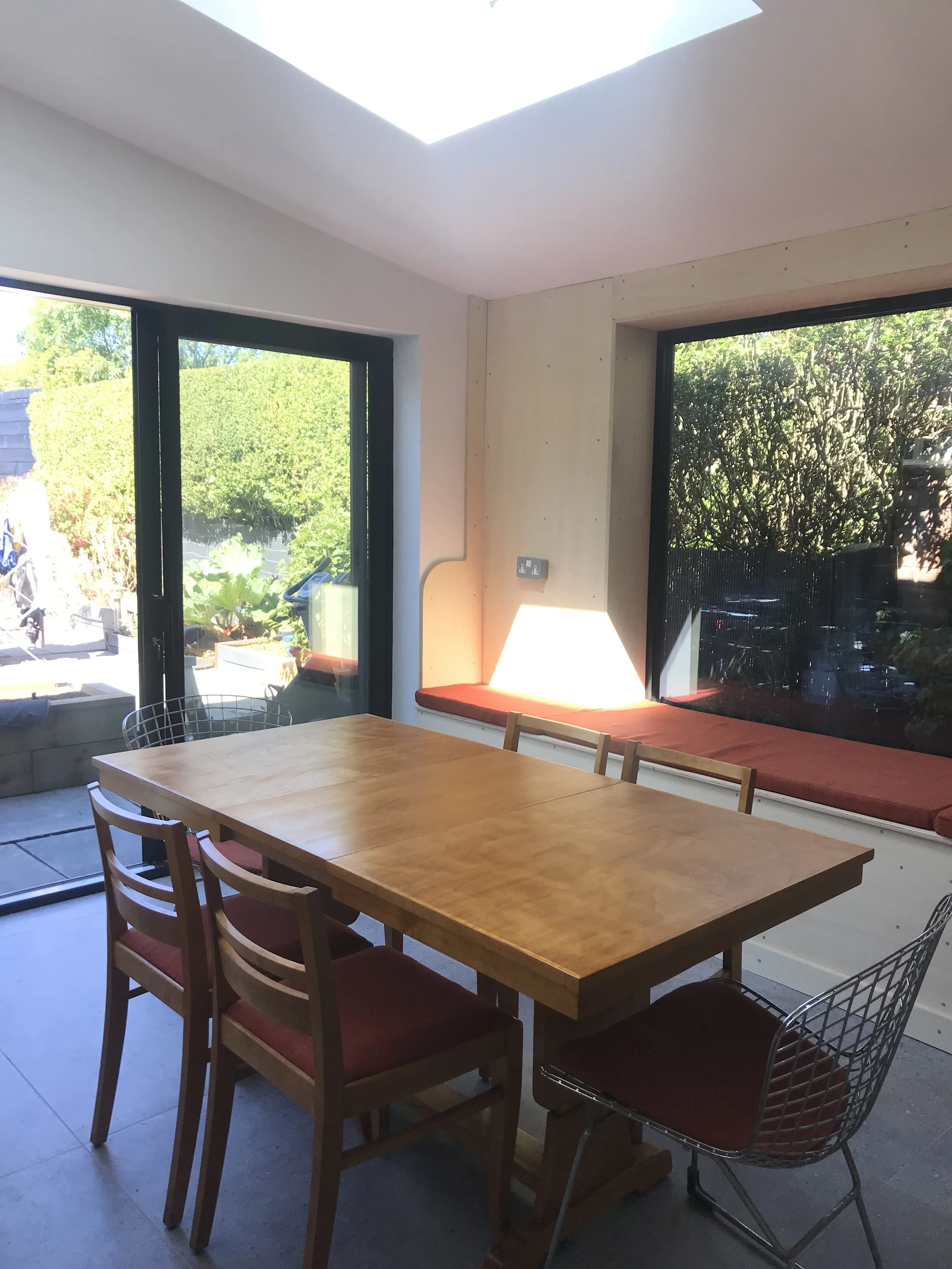 We worked closely with our clients to devise a suitable material pallet to compliment their existing furniture pieces. Using Poplar faced ply wood for the feature wall and bench seat added a lightness to the main dining area whilst enhancing the golden glow of their prized, newly restored, dining set.