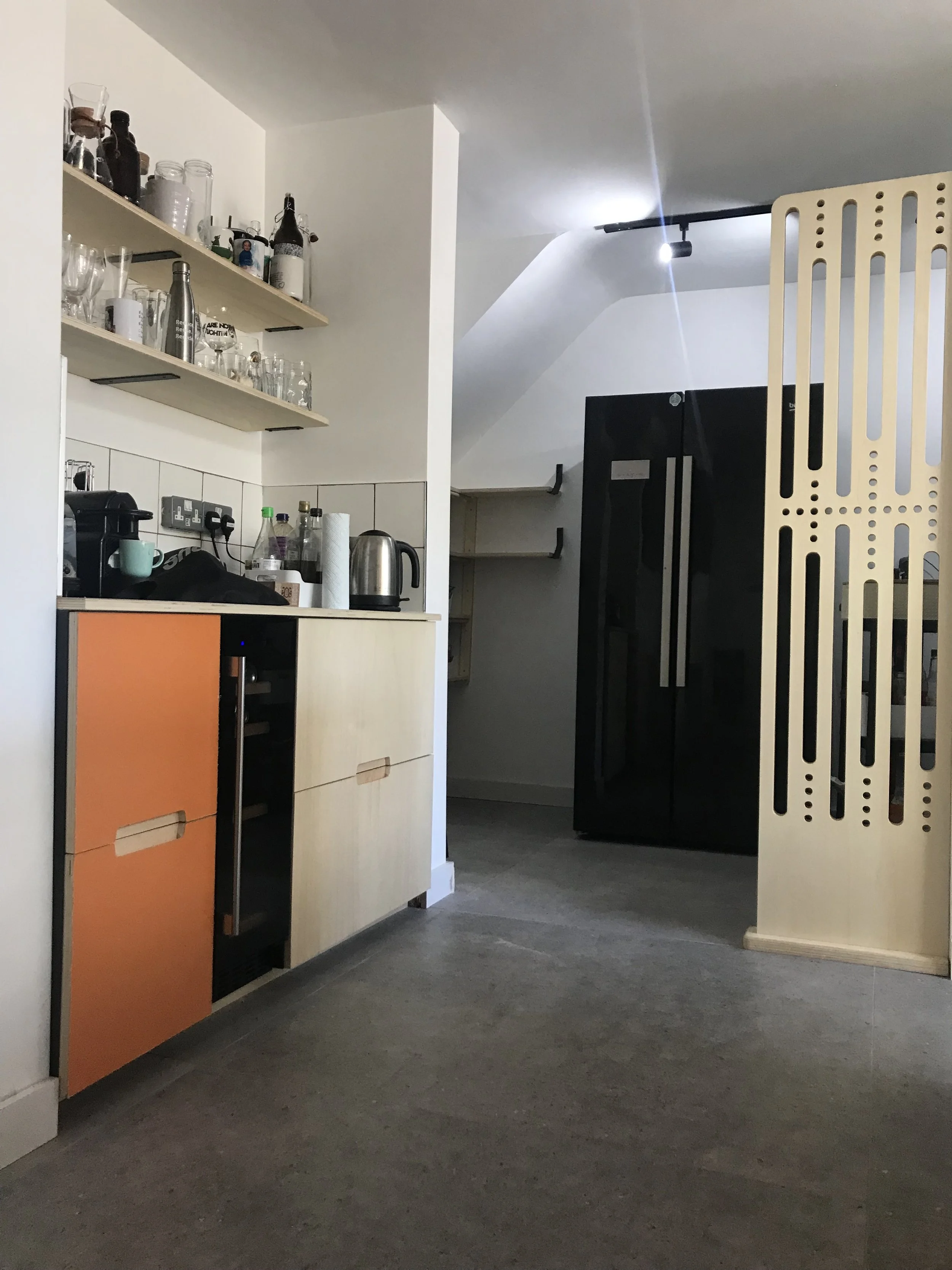 We continued this into the kitchen to create a continuity between the spaces. Alternating the cabinet fronts between natural Poplar and Orange laminate. We upholstered the dining chairs, bench seat in an orange mix fabric to again tie in with the kitchen fronts.
